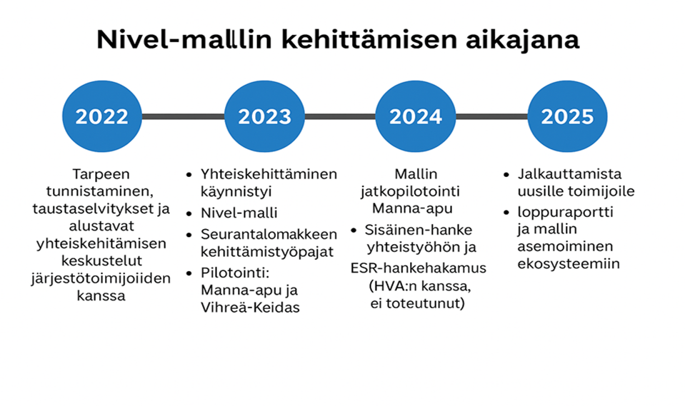- Ensimmäinen pilotti (2023): Manna-Apu ja Vihreä Keidas ry testasivat mallia omissa toimintaympäristöissään. Pilotit toteutettiin järjestöjen toiminnassa järjestöjen ja osallistujien vapaaehtoisuuteen pohjautuen.
