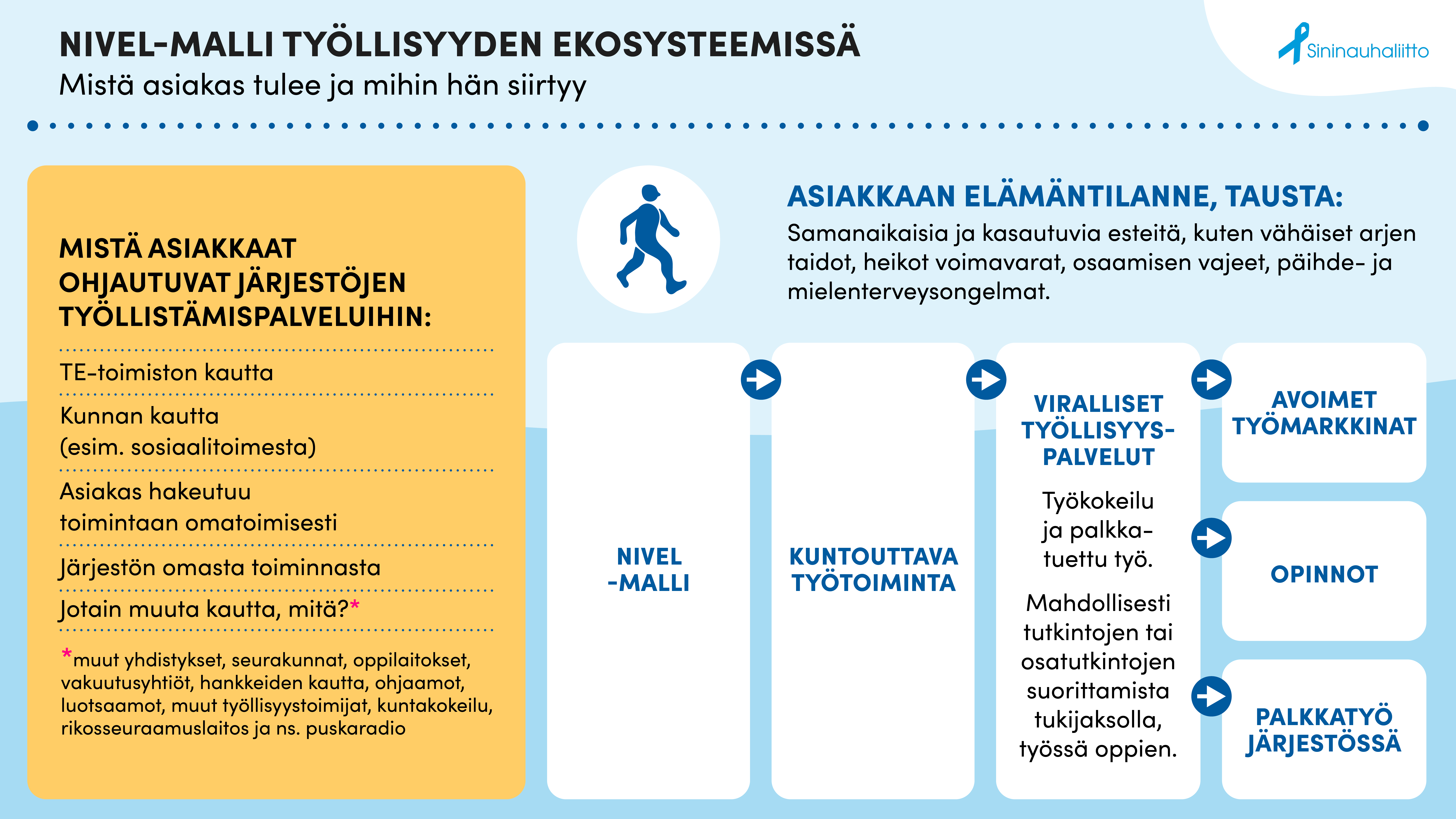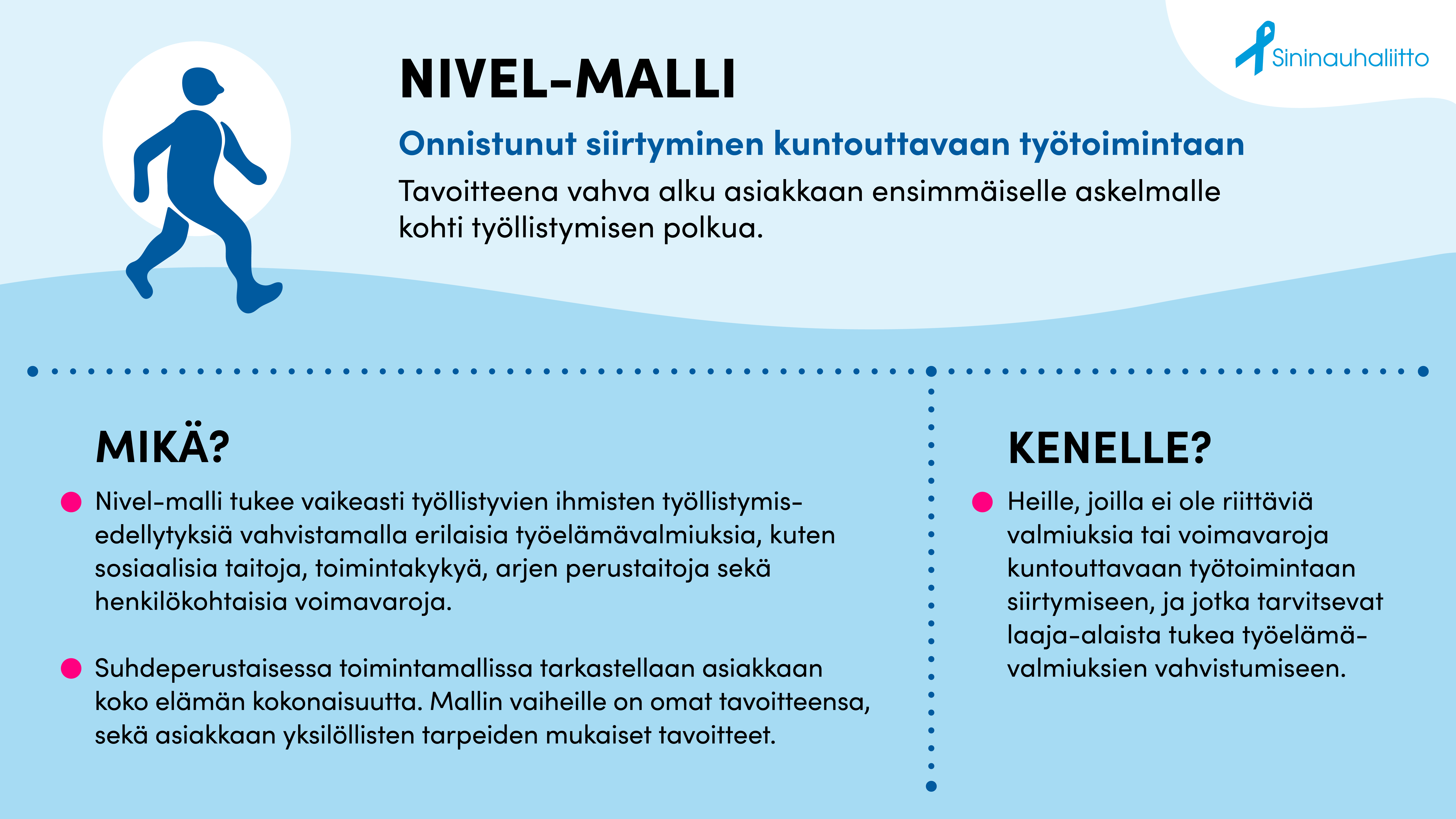 Nivel-malli on kehitetty vastaamaan tarpeeseen, jossa haastavassa työmarkkina-asemassa olevat henkilöt jäävät vaille riittävää tukea. Nivel-malli tarjoaa yksilöllistä tukea ja luo vahvan pohjan arjen taitojen, toimintakyvyn ja työelämävalmiuksien vahvistamiseen. Kehittämistyö toteutettiin Sininauhaliiton ja sen jäsenjärjestöjen yhteistyönä Kuntoutussäätiön tuella.